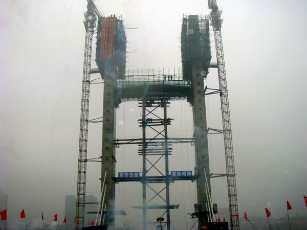 作為整座大橋的控制性工程,主索塔施工一直是各方關注的焦點,并成為影響我項目總體施工進度的主要因素。為此,項目部領導班子經(jīng)過多次研究分析并大膽決策,決定改變以前多點開花,齊頭并進的工作方向,將工作重心向主索塔偏移,從人員到設備優(yōu)先滿足主索塔的施工需要。針對施工過程中遇到的技術難題,項目部及時邀請有關專家及公司領導到施工現(xiàn)場指導,制定解決方案。在積極趕超進度的同時,項目部將安全和質量擺放在首要位置。在施工過程中,項目部不僅建立了完善的安全、質量保障體系,更積極增加投入,全方位確保主索塔施工質量,并使主索塔施工速度得到穩(wěn)步提升。