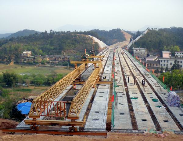 站塘大橋的中心樁號為K1497+532,全長306米,共12跨,是我標段最長的一座大橋。上部構(gòu)造為25米預(yù)應(yīng)力箱梁,共96片,下部結(jié)構(gòu)共有樁基52根、蓋梁26片。站塘大橋的梁板是從2號梁場運過來的。在運梁過程中,由于遇到連陰雨天氣,導(dǎo)致道路潮濕,不能承受梁板的重量。針對這種情況,項目部積極開拓思路想辦法,不等不靠,通過用碎沙石鋪出一條道路來保證運梁不受影響。在春節(jié)復(fù)工后,項目部又加大人力物力投入。架梁過程中,橋梁技術(shù)人員始終堅守在施工一線,做好分部分項技術(shù)交底和安全防護工作,保證了架梁的進度、質(zhì)量和安全。