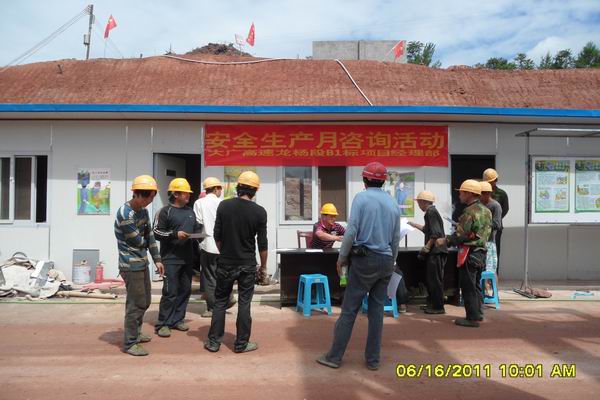 上午10時半左右,贛州高速公司安監(jiān)辦劉主任、項目辦綜合處李處長等業(yè)主單位領(lǐng)導(dǎo)來我標段現(xiàn)場,指導(dǎo)檢查安全月咨詢活動開展情況,并接受現(xiàn)場工人有關(guān)安全生產(chǎn)知識的咨詢。在對我標段安全生產(chǎn)月咨詢活動開展情況表示贊許的同時,劉主任一行也提出了要求,希望我部采取多種形式開展安全生產(chǎn)宣傳教育工作,使一線工人明確自己的權(quán)利、義務(wù),掌握施工安全知識和技能。