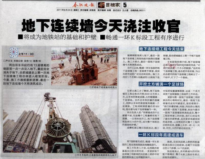 合肥晚報(bào)重點(diǎn)報(bào)道一環(huán)K標(biāo)地下連續(xù)墻施工 發(fā)布時(shí)間:2011年08月29日 來(lái)源: 發(fā)布人: 作者: 瀏覽:3134次