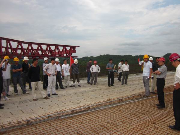 下午15:30,在大廣高速龍楊段項目辦、高駐辦相關(guān)領(lǐng)導(dǎo)帶領(lǐng)下,全線各高駐辦、施工單位主要負(fù)責(zé)人徒步參觀了我標(biāo)江口大橋施工現(xiàn)場。實(shí)地考察中,我標(biāo)項目經(jīng)理羅權(quán)針對水混凝土橋面鋪裝施工情況作了簡要介紹,并就部分施工細(xì)節(jié)問題與觀摩團(tuán)進(jìn)行了深入交流。
