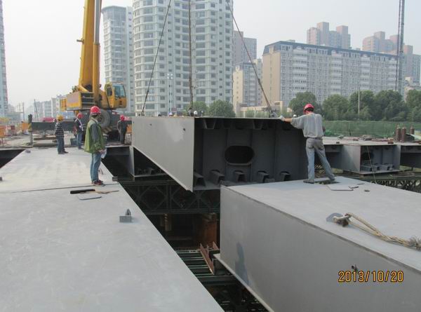 回顧跨南淝河橋鋼箱梁的施工過程,項(xiàng)目全體員工共同努力,克服了許多技術(shù)和吊裝難題。工程前期現(xiàn)場(chǎng)勘查發(fā)現(xiàn),橋梁東側(cè)位于現(xiàn)狀110kv高壓線下,河南岸的東側(cè)和西側(cè)分別有高壓鐵塔和污水泵站,大噸位吊車無法滿足安全施工條件。項(xiàng)目部技術(shù)人員根據(jù)橋型特點(diǎn)和場(chǎng)地特殊環(huán)境、設(shè)備要求, 上報(bào)設(shè)計(jì)單位將原設(shè)計(jì)20+30+20m三個(gè)制作段架設(shè)變更為16+10+18+10+16m五段架設(shè),并通過專家論證評(píng)審,解決了關(guān)于鋼箱梁架設(shè)存在的重要疑難。后期架設(shè)時(shí)為了確保吊裝100%安全,杜絕安全隱患,通過項(xiàng)目部與多方努力協(xié)調(diào),在10月20日架設(shè)東側(cè)110kv高壓線下鋼箱梁時(shí),高壓線暫停供電。全力做到放心安全的架好每一片梁。